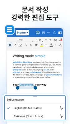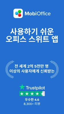 언제 어디서든 끊김 없는 작업을 위해 MobiOffice는 클라우드 기반의 유연한 환경을 제공합니다. MobiDrive에서 5GB의 무료 저장 공간을 즉시 이용하거나, 기존 Google Drive, OneDrive, Box, Dropbox 계정을 손쉽게 연동할 수 있습니다. Windows PC를 비롯해 Android 및 iOS 모바일 기기 간의 완벽한 연동을 통해 작업을 시작한 곳이 어디든 중단 없이 이어갈 수 있습니다. Microsoft, OpenOffice, Apple iWork 등 수백 가지에 달하는 광범위한 파일 형식 호환성과 65개 이상의 언어 지원으로 전 세계 모든 사용자에게 최적화된 경험을 선사합니다. 최신 Android 버전에 맞춰 세심하게 설계된 사용자 친화적인 인터페이스는 직관적인 조작을 가능하게 합니다.